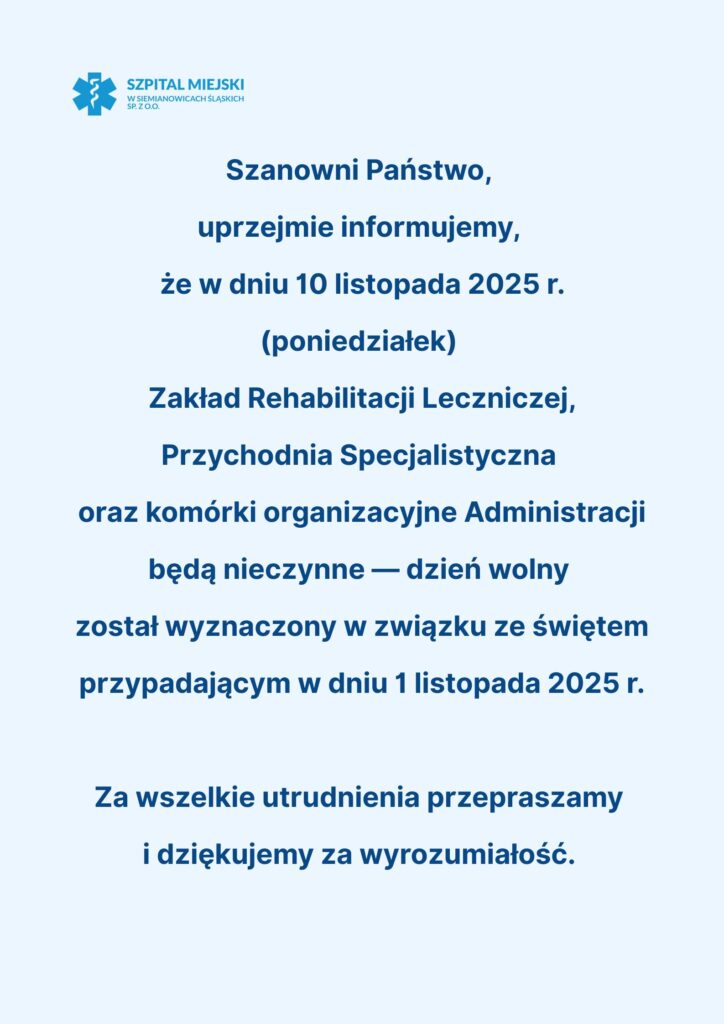 10 listopada Przychodnia Specjalistyczna, Zakład Rehabilitacji Leczniczej oraz Administracja będą nieczynne