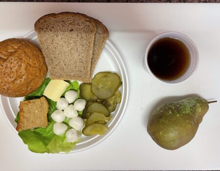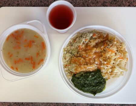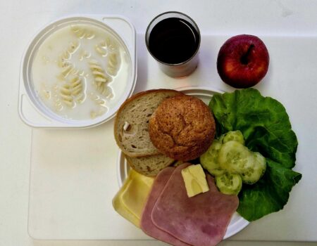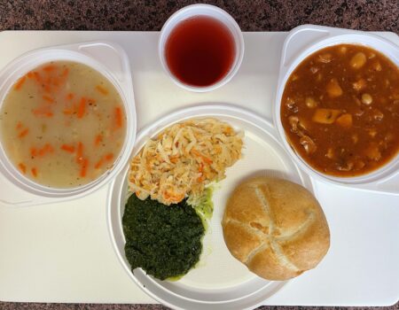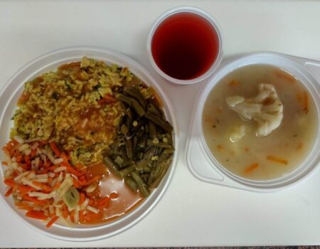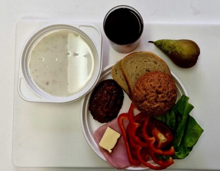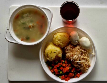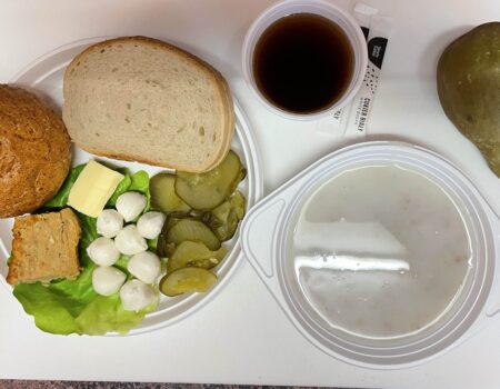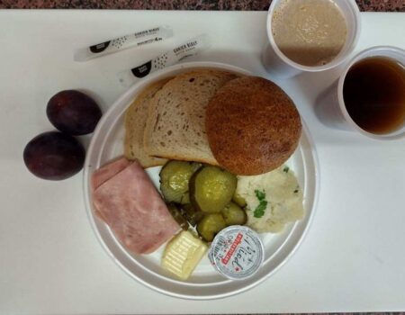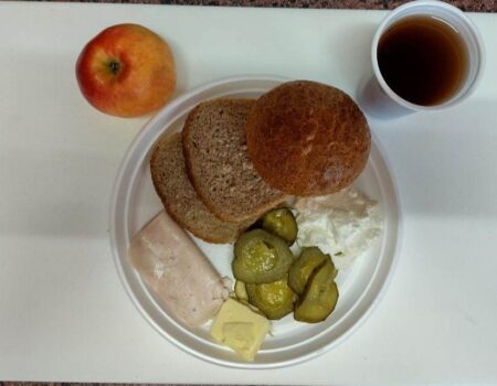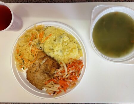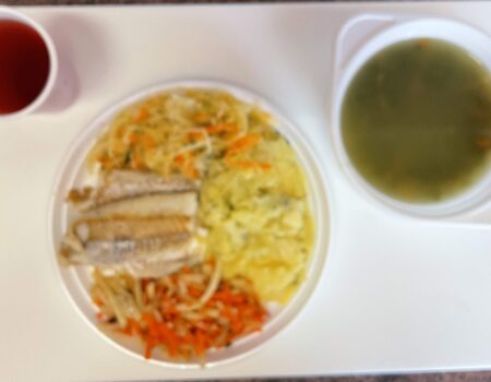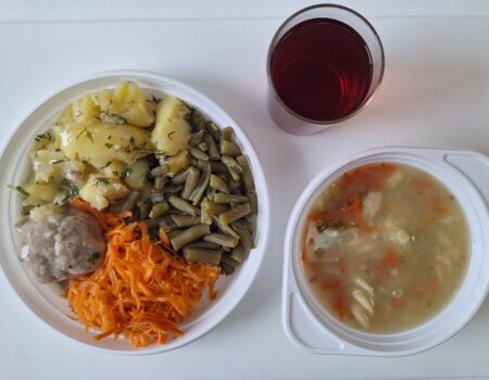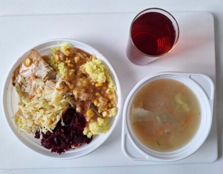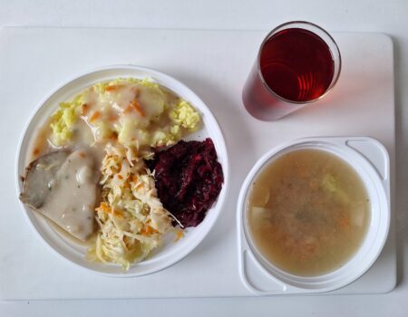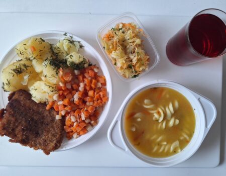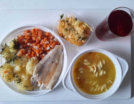 Wielowarzywna z ziemniakami () 350 ml (GLU PSZ, MLE, SEL, ), Szynka wieprzowa gotowana 150 g ,Sos ziołowy () 80 ml ( GLU PSZ, SEL,), Kasza jęczmienna/sypko 200 g ( GLU JĘCZ,), Surówka z rzepy, jabłka i marchewki () 125 g (MLE,), Kompot owocowy z jabłkami* b/c 250 ml.