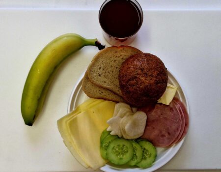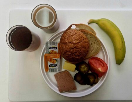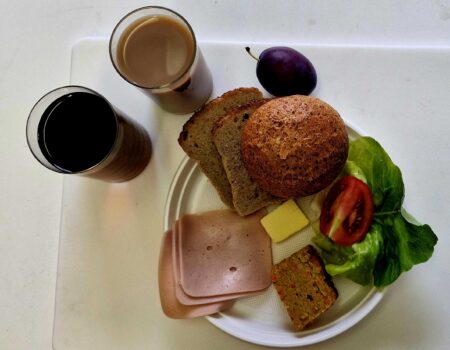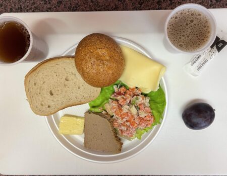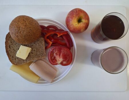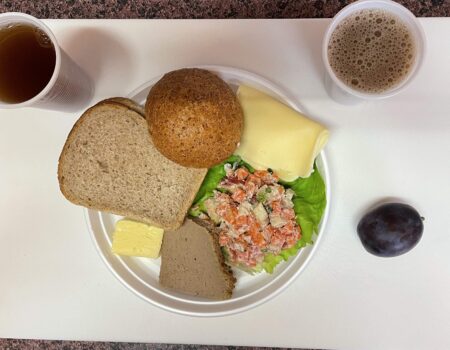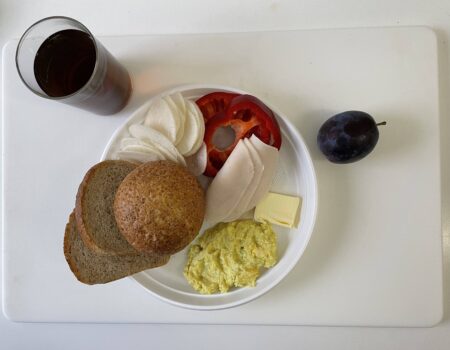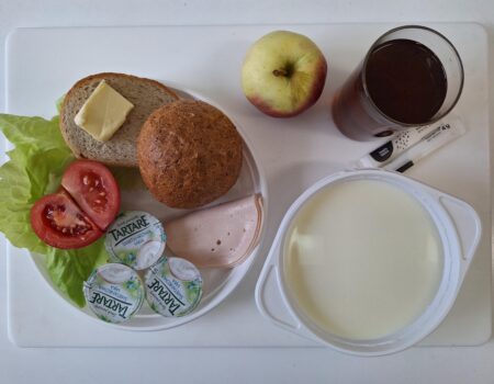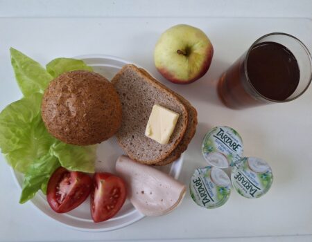 Chleb Graham 50 g (GLU PSZ,), Bułka graham-pszenna 50g 1 szt ( GLU PSZ,),  Masło extra 82% 10 g ( MLE,), Filet królewski z indykiem produkt drobiowy z dodatkiem wieprzowiny średnio rozdrobniony parzony, wędzony 50 g (SOJ, może zawierać: GLU PSZ, JAJ, OZI, MLE, SEL, GOR, SEZ, ), Twarożek 50 g (MLE,), Herbata czarna ekspresowa b/c 250 ml, Sałata zielona 20 g, Pomidor 80 g, Pomarańcza 250g 1 szt, Chleb Graham 30 g (GLU PSZ,), Masło extra 82% 5 g ( MLE,), Serek kanapkowy mini serek twarogowy śmietankowy 30g Hochland 1 szt (MLE,).