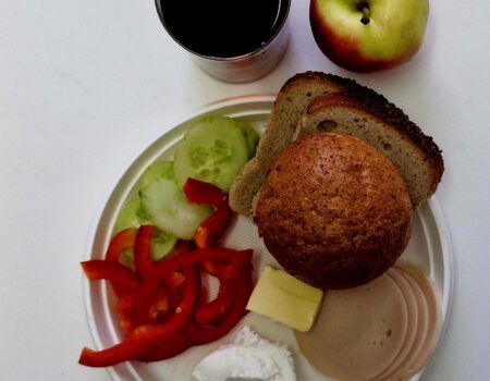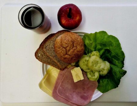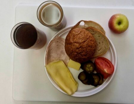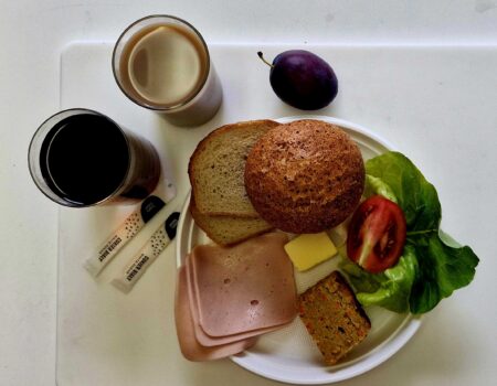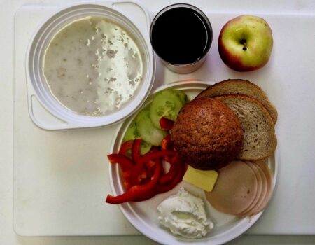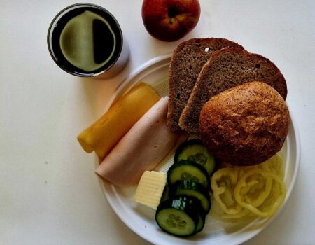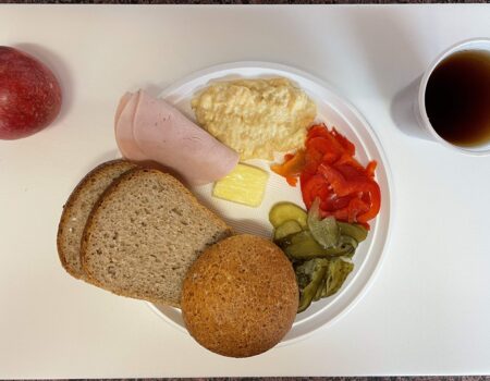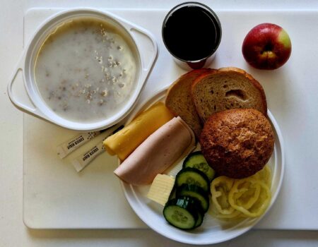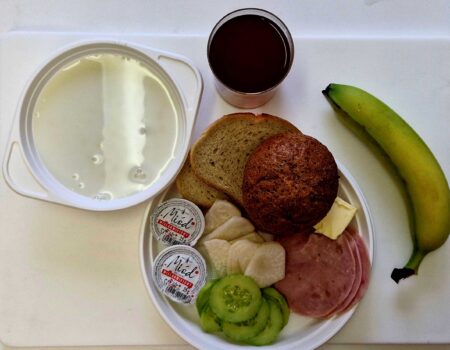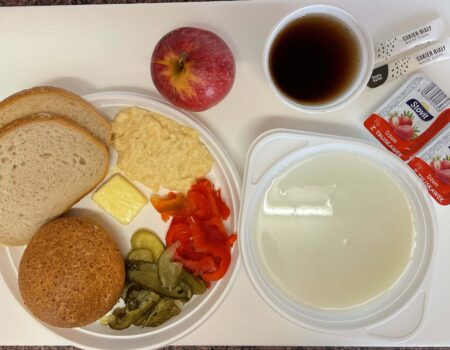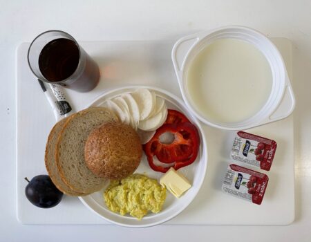 Płatki owsiane na mleku 300 ml ( MLE,GLU OW,), Chleb mieszany pszenno-żytni 50 g (GLU PSZ, GLU ŻYT, ),Bułka graham-pszenna 50g 1 szt ( GLU PSZ,), Masło extra 82%, 10 g ( MLE,),  Miód (25g) 2 szt, Filet królewski z indykiem produkt drobiowy z dodatkiem wieprzowiny średnio rozdrobniony parzony, wędzony 50 g (SOJ, może zawierać: GLU PSZ,JAJ, OZI, MLE, SEL, GOR, SEZ, ), Herbata czarna ekspresowa b/c 250 ml, Cukier 5g (saszetka) 2 szt, Sałata zielona 20 g, Pomidor 80 g,  Pomarańcza 250g 1 szt,