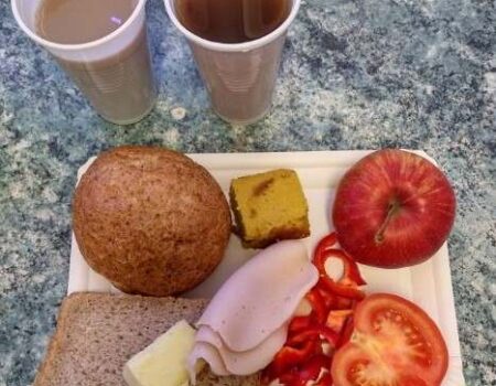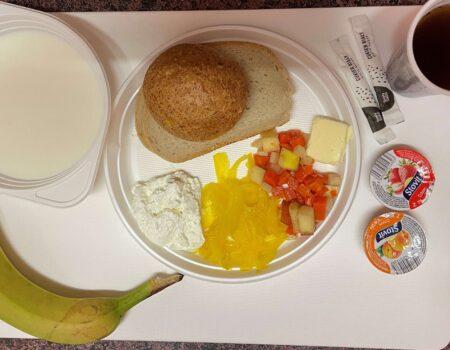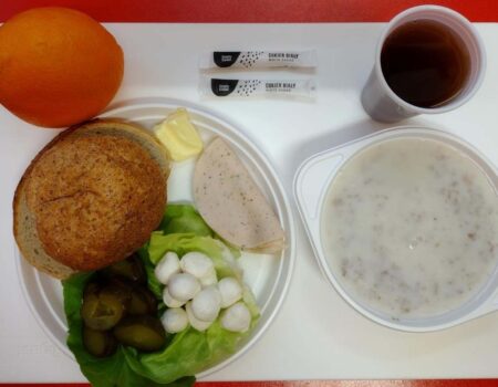 Kasza manna na mleku 300 ml ( GLU PSZ, MLE,), Herbata czarna ekspresowa b/c 250 ml, Cukier 5g (saszetka) 2 szt, Chleb mieszany pszenno-żytni 50 g (GLU PSZ, GLU ŻYT, ),Bułka graham-pszenna 50g 1 szt ( GLU PSZ,), Masło extra 82% 10 g ( MLE,), Filet zapiekany drobiowy 50 g ( MLE,), Pasztet z ciecierzycy* 50 g ( GLU PSZ, JAJ,), Ogórek świeży 50 g, Pomarańcza 1 szt, Sałata lodowa 20 g.