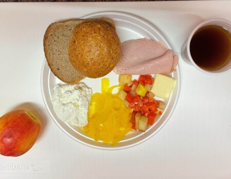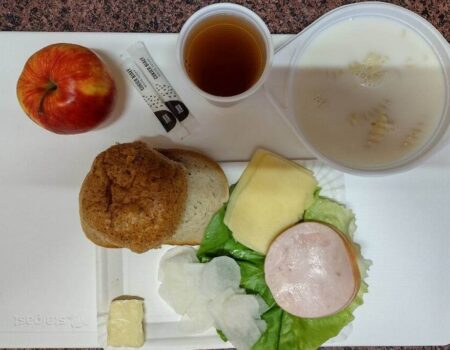 Makaron na mleku 300 ml ( GLU PSZ, MLE, ), Herbata czarna ekspresowa b/c 250 ml, Cukier 5g (saszetka) 2 szt, Chleb mieszany pszenno-żytni 50 g ( GLU PSZ,GLU ŻYT,),Bułka graham-pszenna 50g 1 szt ( GLU PSZ,), Masło extra 82% 10 g ( MLE,), Schab Kruchy z Liszek- wieprzowy, parzony,wędzony 50 g (SOJ, może zawierać: GLU PSZ, MLE, SEL, GOR, S02, ),Ser żółty 50 g (MLE,), Sałata zielona 20 g, Rzodkiew biała 80 g, Jabłko 1 szt.