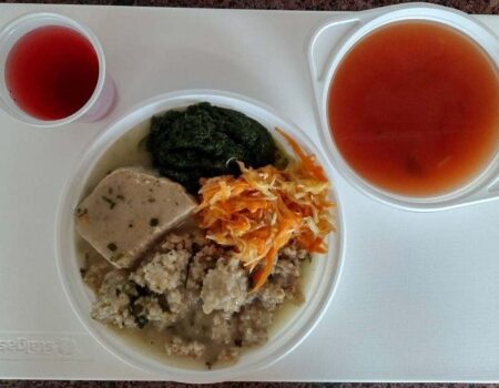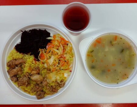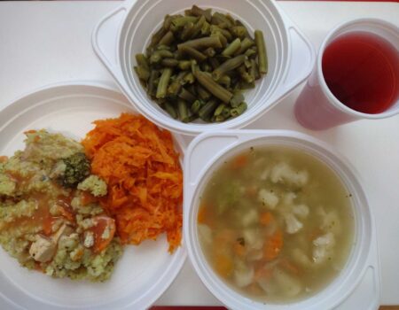 Barszcz biały z ziemniakami * 350 ml (GLU PSZ, MLE, SEL, GLU ŻYT), Ryż na sypko z kurkumą 200 g, Leczo z mięsem drobiowym z indyka – dieta * 200 g, Surówka z marchwi i selera z olejem drobno tarta 125 g ( SEL), Surówka wiosenna 125 g ( MLE), Kompot owocowy* b/c 250 ml