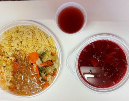 Barszcz ukraiński z ziemniakami* 400 ml ( GLU PSZ, MLE, SEL, ), Makaron 200 g (GLU PSZ,), Sos mięsno-warzywny* (z mięsa wieprzowego) 150 g (GLU PSZ, SEL, ),Brokuł gotowany* 100 g, Surówka wielowarzywna z olejem drobno tarta 100 g (SEL,), Kompot z czarnej porzeczki* b/c 250 ml.