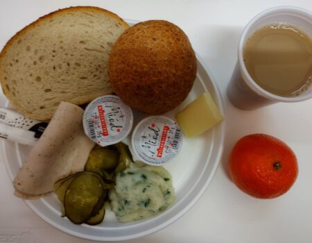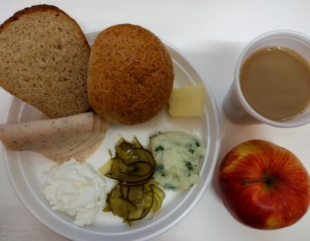 Kawa zbożowa z mlekiem b/c 250 ml ( MLE, GLU ŻYT, GLU JĘCZ, ), Chleb mieszany pszenno-żytni 50 g ( GLU PSZ, GLU ŻYT,),Bułka graham-pszenna 50g 1 szt ( GLU PSZ,),Masło extra 82% 10 g ( MLE,), Miód (25g) 2 szt, Śniadaniowa drobiowa- produkt drobiowy parzony w osłonce niejadalnej 50 g ( może zawierać: GLU PSZ, MLE, GOR, ), Ogórek kiszony 50 g, Herbata czarna ekspresowa b/c 250 ml, Cukier 5g (saszetka) 2 szt, Mandarynka 1 szt, Pasta z kalafiora z natką pietruszki 50g.