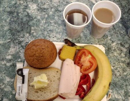 Herbata czarna ekspresowa b/c 250 ml, Cukier 5g (saszetka) 2 szt, Chleb mieszany pszenno-żytni 50 g (GLU PSZ, GLU ŻYT), Bułka graham-pszenna 50g 1 szt ( GLU, PSZ), Masło extra 82% 10 g ( MLE), Pasztet Ciechanowski-Pasztet drobiowy z dodatkiem surowców wieprzowych pieczony 50 g (GLU PSZ, JAJ, SOJ, MLE), Miód (25g) 2 szt, Ogórek kwaszony małosolny 50 g (GOR), Pomidor 50 g, Banan 1szt, Kawa zbożowa z mlekiem z/c 250 ml (MLE, GLU ŻYT, GLU JĘCZ)