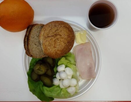 Ser mozzarella kulki 50 g ( MLE,), Polędwica Sopocka wieprzowa,wędzona parzona z dodatkiem wody i białka sojowego 50 g ( SOJ, MLE, może zawierać: GLU PSZ, JAJ, SEL, GOR,),Herbata czarna ekspresowa b/c 250 ml, Cukier 5g (saszetka) 2 szt, Pomarańcza 1 szt. 1 szt, Ogórek kiszony 80 g, Sałata zielona 20 g.